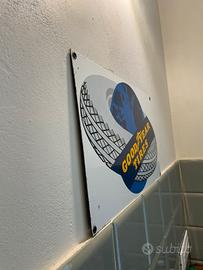 Insegna pubblicitaria in metallo smaltato Goodyear Tires vintage, grafica con globo e battistrada. Oggetto decorativo dal forte impatto visivo, perfetto per garage, officina, studio o ambiente industriale.