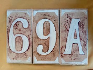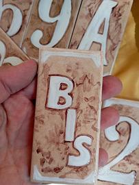 Piastrelle in gres dipinte con colori specifici, adatti all' esterno, 5 x 10 cm, 5 euro cad. due pezzi a 8 euro . eventualmente li faccio anche su ordinazione con altri colori o scritte