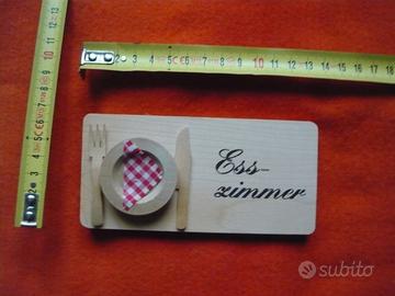 Targhette indicatrici in legno da applicare/appendere alla porta di un locale/stanza per spiegarne la destinazione d'uso. Le indicazioni sono in lingua tedesca e significano: