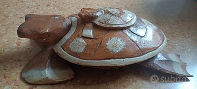 Animale in legno intagliato e dipinto a mano raffigurante una tartaruga e il suo piccolo sul dorso. Presenta un'imperfezione su una zampa, come da foto, già così in origine proprio in quanto manufatto artigianale. Nasce come posacenere (la parte superiore si solleva totalmente) ma utilizzabile anche come porta anelli, portagioie o soprammobile. Arreda ed è altamente decorativo. Lunghezza 30 cm, larghezza 16 cm.