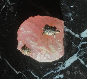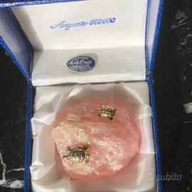 Elegante fermacarte di quarzo rosa su cui poggiano 2 tartarughe in argento dell'orafo Bortolozzo di Padova; anni '60-'70. dimensioni circa 8x8cm Ancora nella confezione originale
