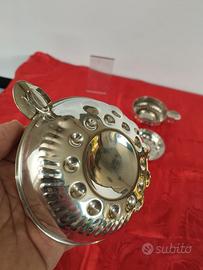 Vendo tastevin in metallo argentato del diametro di 12 cm, mentre la misura comprensiva del manico è di 15 cm. al costo di 50 euro ; Vendo inoltre come da foto tastevin in metallo argentato, Christofle France coll. Gallia in ottime condizioni al costo di 75 euro , Tastevin " La Tassee - Lyon " in metallo probabilmente argentato, pubblicitario dell'omonimo ristorante " La Tassee" sito in Lione al costo di 45 euro .