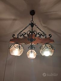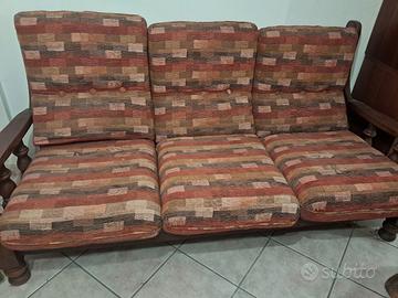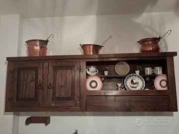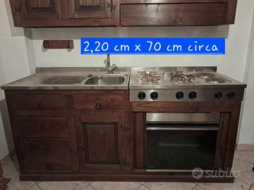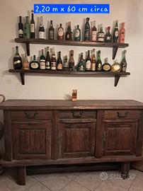 Mobili in Legno Massiccio e Cucina Completa Un set di mobili robusti e di carattere, ideali per chi ama lo stile rustico e il legno massiccio. Cucina Completa: Blocco cucina in legno scuro con piano in acciaio inox, lavello, piano cottura a gas e forno integrato. Dimensioni approssimative: 2,20 cm \times 70 cm. Credenza/Mobile Basso: Grande credenza in legno scuro con cassetti e ante. Ottima per sala da pranzo o soggiorno. Tavolo da Pranzo Ruvido (Live Edge): Lungo tavolo da pranzo in legno massiccio, con bordo laterale grezzo (stile "live edge"), accompagnato da sedie abbinate. Divano a Tre Posti: Struttura in legno e cuscini sfoderabili con fantasia geometrica nei toni del rosso/marrone. Perfetto per un ambiente rustico o come pezzo da restauro. Mensole Portabottiglie: Due mensole in legno, lunghe 2,20 m, ideali per bottiglie o oggetti decorativi. Ottimo per amanti del legno, arredamento rustico o per seconde case. Vendibili anche separatamente.