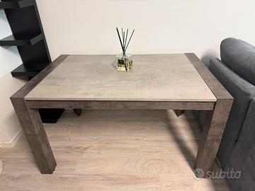 Tavola allungabile, in colore grigio, due grigi diversi, da quattro posti a otto posti, inutilizzata perché da noi occupa troppo spazio. A parte se interessati, vendo anche quattro sedie nere in simil pelle.