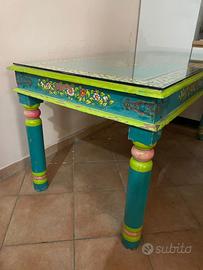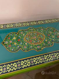 Vendo splendido tavolo rettangolare in legno con piano decorato a mano in stile etnico/orientale. Il piano presenta una finitura lucida con base verde-turchese e raffinata decorazione floreale centrale, contornata da una cornice con motivi geometrici e floreali in colori vivaci.