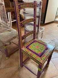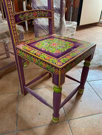 Il set comprende 6 sedie abbinate, anch'esse interamente decorate a mano con colori brillanti (viola, verde lime, arancione e rosa) e motivi floreali che riprendono lo stile del tavolo. Ogni sedia è un piccolo pezzo d'arte, perfetta per dare carattere e originalità a qualsiasi ambiente.