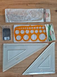 Tavola da disegno A3 Fabercastell (modello 171273) con accessorio per disegno ad angolo (modello 171200). Sono inclusi anche vari righelli, schemi di cerchi e curve, matite portamine (HB, 2H, 4H) con temperino speciale. La custodia per il trasporto è inclusa.