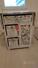 Mobiletto con tavola da stiro a scomparsa stile shabby con ceste contenitore e un' antina in tessuto a fiori.