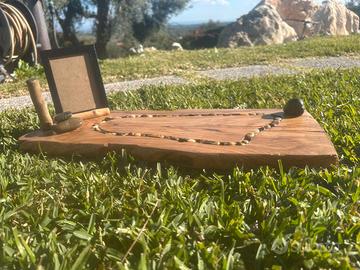 Porta foto e porta cellulare connpietre di fiume su tavola in legno di ulivo massiccio. Da scrivania, ingresso, salotto… Oggetto interamente fatto a mano.