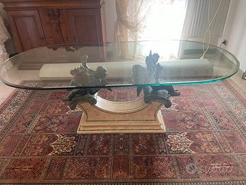 Splendido tavolo da sala con piano ovale in cristallo sostenuto da una base artistica con sculture decorative stile classico poggiata su solida base di marmo. Il tavolo è robusto, stabile e di grande impatto scenografico, ideale per ambienti eleganti o arredamenti di pregio.Misure:lung.198 larg.96 alt.75 ritiro esclusivamente in loco non effettuiamo spedizione