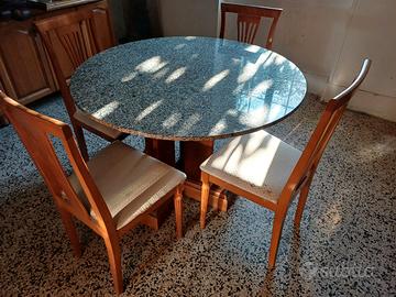 Tavola rotonda con piano in marmo, base e piedi in legno massello e 4 sedie