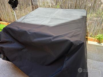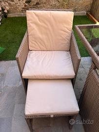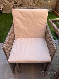 Vendesi tavolo com 4 sedie con schienale, braccioli e due cuscini e 4 pouf, per un totale di 8 posti In ottime comdizioni, con copertura come visibile in ultima foto. Ritiro a mano ad Arenzano