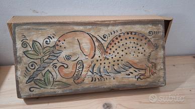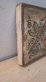 Tavoletta in legno decorata a mano raffigurante una figura tipica dei bestiari quattrocenteschi (unicorno).