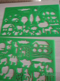 Tavolette per stencil in plastica con soggetti vari ( animali, cavalli, moto, auto...) più tre stencil in acetato. Le tavolette misurano circa 27 x 18 cm.