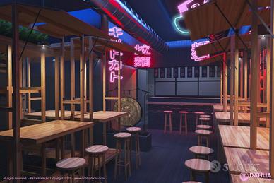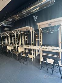 Vendesi 9 tavoli artigianali in legno con tettoia richiudibile stile mercato del pesce, con rispettivi sgabelli e panche(rivestite in ecopelle). I tavoli possono ospitare quattro commensali o essere collegati tra loro tramite una mensola a ribalta.