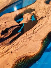 Il legno d' ulivo con la sua storia secolare , la sua venatura e le sue crepe naturali, si abbina perfettamente con la resina che illumina e valorizza i vuoti naturali creando effetti unici.