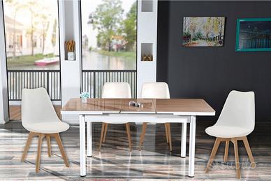 Vendo TAVOLO IN VETRO TEMPERATO ALLUNGABILE MARRONE COMPLETO DI SEDIE BIANCHE CON CUSCINO - DESIGN - TAVOLO PER SALA DA PRANZO / CUCINA / RISTORANTI / PUB / CASA VANCANZE. TAVOLO CON SERIGRAFIA INCISA DIRETTAMENTE SUL VETRO TRAMITE STAMPANTE LASER UV. QUALITA' ELEVATA (NESSUNA PELLICOLA), STAMPA ULTRAVIOLETTI CON SISTEMA DI RISCALDAMENTO AD INCISIONE DIRETTA SUL VETRO, QUESTO SISTEMA GARANTISCE UN PRODOTTO DAL DESIGN UNICO SENZA RINUNCIARE ALLA QUALITA'. PREZZO DA INGROSSO, COMPRENSIVO INFATTI ANCHE DEL SET COMPOSTO DA 4 SEDIE IN POLIPROPILENE BIANCO CON CUSCINO IN ECOPELLE INCLUSO, al fantastico prezzo di 370€ (solo costo del tavolo con le sedie).