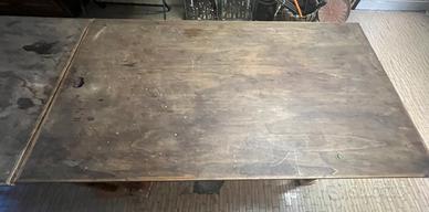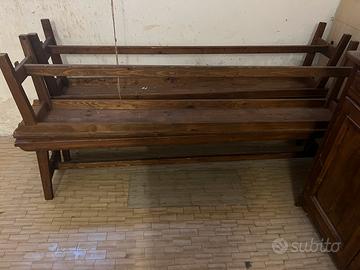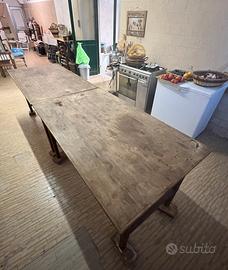 N. 2 tavoli con n. 4 panche in legno grezzo artigianali. Condioni eccellenti. Nessun segno di usura. Eventualmente da ritinteggiare. Misure tavola 90x150 cm. Lunghezza complessiva 300 cm. Misura panche 200 cm ciascuna.