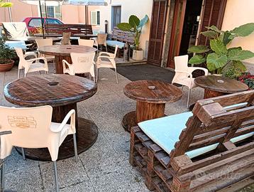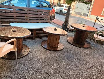 Sei tavoli bobina ,rivestiti e lavorati molto bene,con sedie di plastica beige,tre panchine compreso di cuscini per un bellissimo dehor..