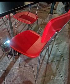 Vendo 6 tavoli quadrati in legno nero dal design moderno ed elegante, abbinati a 18 sedie rosse in pelle, comode e di grande impatto visivo.