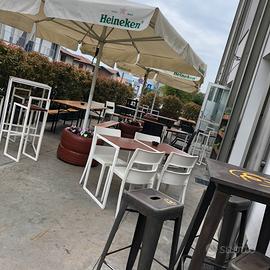 Vendesi tavoli in ferro battuto. Lavorati in bianco e piano bordeux rimovibile. 6 tavoli bassi e due alti con 8 sgabelli abbinati. Preferibilmente vendita completa. Non si effettuano s spedizioni.