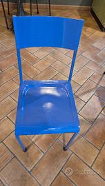 Set di tavoli in legno teack con doghe dipinte con base in ghisa primi del 900 80x80 h77 Euro 200 cadauno disponibili 22 pezzi Sedia in ferro naturale invecchiato vari colori seduta 40x40 h83 fascia schienale h17 Euro 25 cadauno disponibili 56 pezzi