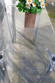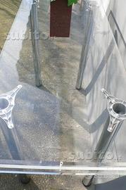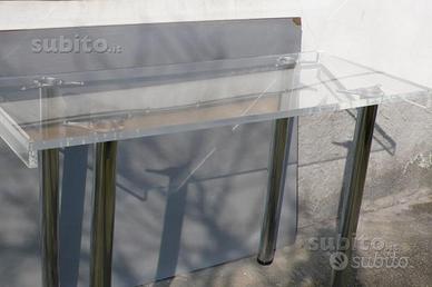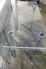 Tavoli in plexiglass con gambe cromate smontabili e regolabili in altezza. Plexiglass categoria trasparentissimo spessore 2 cm gambe applicate con solo un giro di vite smontabili completamente rimane solo il piano in plexiglass con attaccati i supporti gambe Misure del piano 132X55 cm altezza piano lavoro regolabile 85-95 cm