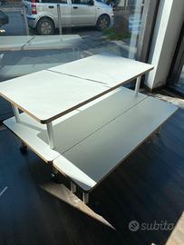 Tavoli Bianchi per esposizione merci, piano legno con fascia circolare beige e piedi in ferro laccato bianco in varie misure quadrati o rettangolari + panche uguali in varie lunghezze a partire da € 49 .NUOVI IMBALLATI ! MAI USATI !