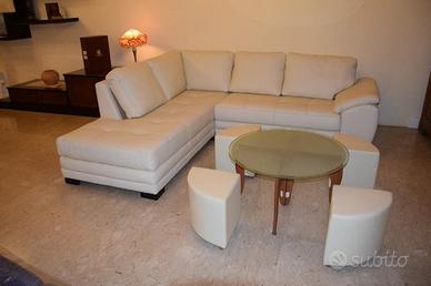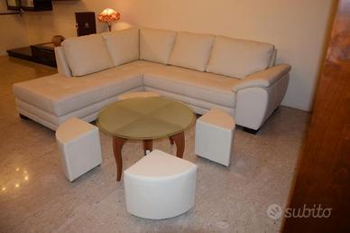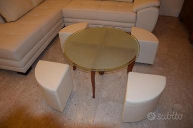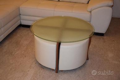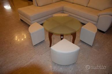 In vendita tavolinetto nuovo , esposto in negozio SOTTOCOSTO per rinnovo esposizione, con basamento colore ciliegio, con piano in vetro satinato e con quattro comodi puff in ecopelle colore beige.