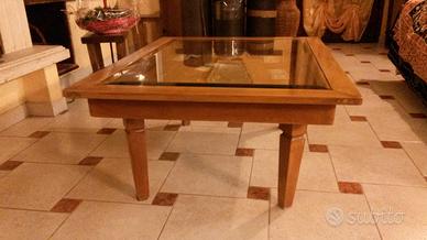 Tavolo artigianale in legno con vano contenitore per riporre piccoli oggetti, monete, francobolli o addirittura un quadro con ripiano in vetro
