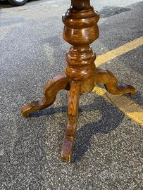 Tavolinetto antiquariato sorrentino con stesso intarsio sul piano, sul bordo esterno e sulle quattro zampe innestate nel ceppo centrale.