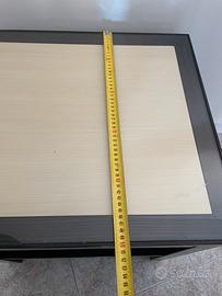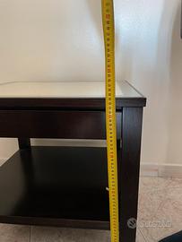 Tavolinetto multiuso con cassetto. Colore noce scuro e riquadro rovere sbiancato con piano in vetro.