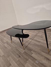 n.2 tavolini da salotto restaurati soprapponibili anni 50/60 a forma di fagiolo gambe in metallo verniciato nero conificate con puntale in ottone piano verniciato nero