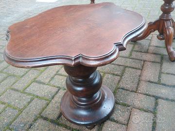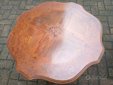 Tre eleganti e raffinati tavolini-caffè da salotto in legno di noce lucidato, due con gamba tornita e piani impiallacciati/intarsiati (uno tondo, con bordatura e motivi curvilinei, e l'altro sagomato, con decori ed effigie centrale floreale) e il terzo più basso, con colonna spessa modanata, tutti in stile classico o vintage (anni '50-60) ma adatti ad ogni tipologia di arredamento, anche di design moderno/contemporaneo, davvero belli e ben conservati;