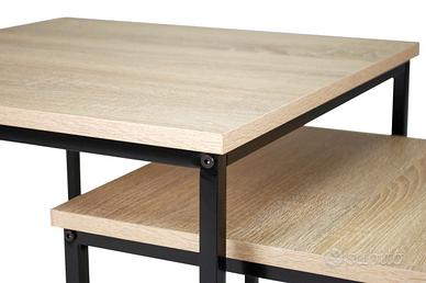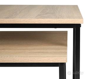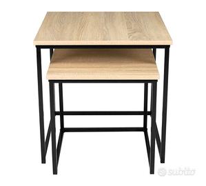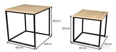 Tavolini da salotto sovrapponibili modello Double by Samira, con top in truciolare finitura legno e struttura in metallo verniciato nero. Dal design essenziale, questo set di 2 tavolini da caffè contribuisce a donare un effetto armonioso al tuo arredo sia moderno che vintage. Questi tavolini da divano in stile industriale, si inseriscono facilmente in qualsiasi ambiente come soggiorno, cucina, sala d'attesa o ufficio. Grazie alle loro dimensioni ed alla loro versatilità si possono disporre in qualsiasi angolo della casa, anche separatamente, in cui godersi un caffè o un tè in compagnia. Facili da montare grazie alle istruzioni che troverete all'interno della confezione.Prodotto nuovo a prezzo di fabbrica. Scheda Tecnica Dimensioni: Tavolino grande 49,5x49,5x49,5(h) cm; Tavolino piccolo 39,5x39,5x39,5(h) cm; Peso: Tavolino grande 4,47 Kg; Tavolino piccolo 3,07 Kg;