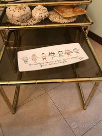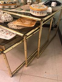 Vendo, come da foto, n. 3 tavolini di arredamento per soggiorno. Struttura dorata e piani in vetro.
