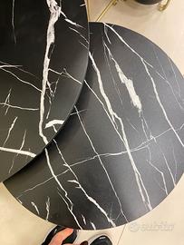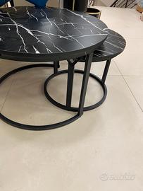 Vendo elegante set di due tavolini rotondi con piano effetto marmo nero e venature bianche. Struttura in metallo resistente, design moderno e salvaspazio: il tavolino piccolo si inserisce sotto quello grande, ideale per soggiorno, salotto o zona relax.