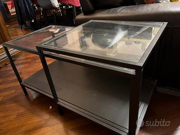 Tavolini Ikea in vetro e metallo nero. Sono sovrapponibili a piacere oppure utilizzati separati come si vede dalle foto. Le misure del tavolino rettangolare sono cm 90 x 45, quello quadrato cm50 x 50. Se sovrapposti completamente sono cm cm 93 x 50. Hanno i segni dovuti solo all usura, i vetri non sono scheggiati. Sono già completamente smontati e imballati. Sconsiglio la spedizione x la presenza di vetri.