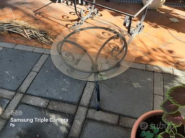 tavolini in ferro battuto per interni e per giardino , uno completo di vetro posaoggetti , l'altro come da foto.
