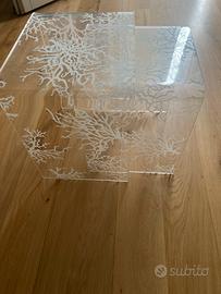 Set 2 tavolini sovrapponibili in plexiglas con serigrafia coralli bianchi. Presentano alcuni segni. L 36 P 30 H 40 L 31 P 30 H 36