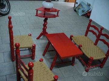 Vendo completo originale di sedie, tavolini e lampada. Le sedie sono alte 31 cm, il tavolino rettangolare 41 cm ed il tavolino ad angolo 74 cm. Possibilità di consegna gratuita brevi distanze.
