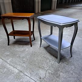3) N.2 tavolini a 2 piani in legno massello: uno è laccato argentato e uno è stato trattato con gommalacca dimensioni 66cm x69c. alt.70cm. PREZZO 50 EURO caduno