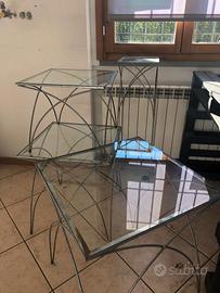 4 tavolini vintage di diverse misure in ferro lavorato e ripiani in vetro, vendibili anche separatamente.