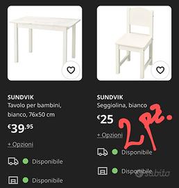 Vendo tavolino + coppia sedie per bimbi IKEA linea Sundvik in ottime condizioni, tutto usato poco poi riposto in cantina.