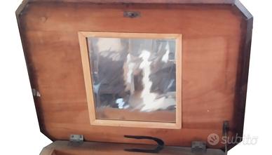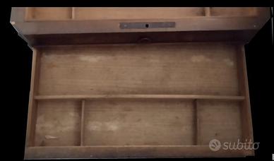 DUE CASSETTI A SCOMPARTII: IL PRIMO, IL CUI PIANO RIBALTATO CONTIENE UNO SPECCHIO D'EPOCA, ORIGINALE.