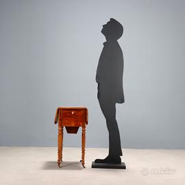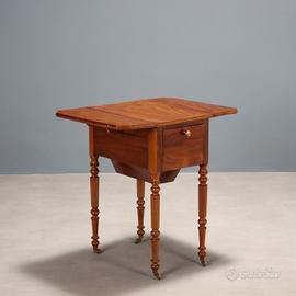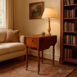Tavolino a bandelle in mogano, coppia di cassetti sotto piano su un lato, anta a