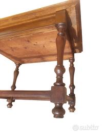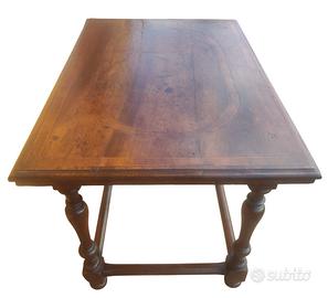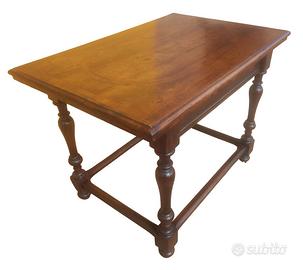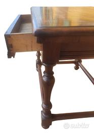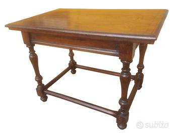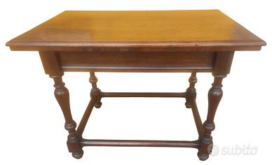Mobile raffinato ed estremamente elegante, in configurazione da centro, con cassettino celato nella fascia e struttura poggiante su quattro gambe tornite a rocchetto raccordate da traverse.