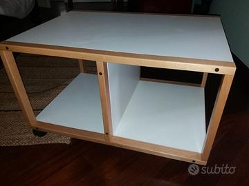 Tavolo basso con due vani, dotato di quattro ruote per spostarlo comodamente. Usato, ma in più che buono stato. Colori bianco e legno chiaro. Misure: 72x52 cm, altezza (comprese le rotelle): 45 cm.