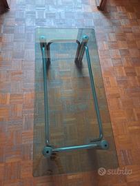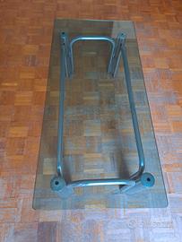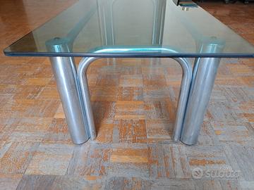 Tavolino basso per salotto in acciaio cromato e top in vetro temperato spesso 1 cm, design vintage originale anni '70,le quattro doppie gambe d'appoggio sono collegate da traversa sempre in tubo d'acciaio curvato e cromato. Il vetro è rettangolare con gli angoli arrotondati e appoggia sulle quattro doppie gambe. Dimensioni lung 112 cm larg 52 cm x altezza da terra 35,5 cm.Cedo causa sgombero appartamento e non amante del genere.Prezzo trattabile per rapida conclusione della trattativa.