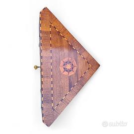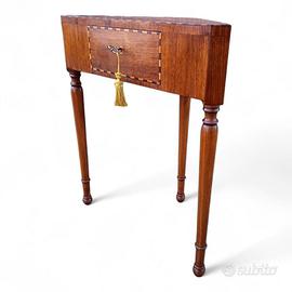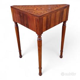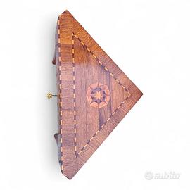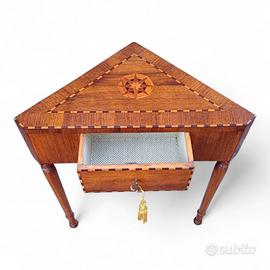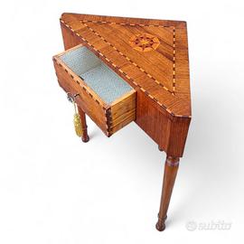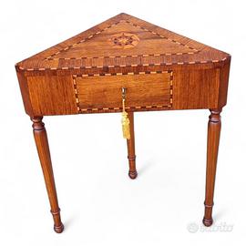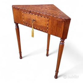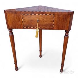 Questo elegante tavolino cantonale con intarsi è un'aggiunta di stile a qualsiasi ambiente. Realizzato in legno di noce di alta qualità, questa angoliera presenta una cassettino sapientemente intarsiato e sul piano un motivo centrale con stella. I bordi smussati e le finiture lisce aggiungono un tocco di raffinatezza. Con le sue linee pulite e il design tradizionale, questa angoliera si adatta perfettamente a qualsiasi arredamento classico. Misurando circa 78 cm di altezza e 46 di lato cm di lato, riempie quegli angoli di casa difficilmente arredabili..Un'opera d'artigianato di alta qualità, questa tavolino ad angolo è un investimento duraturo per la tua casa.